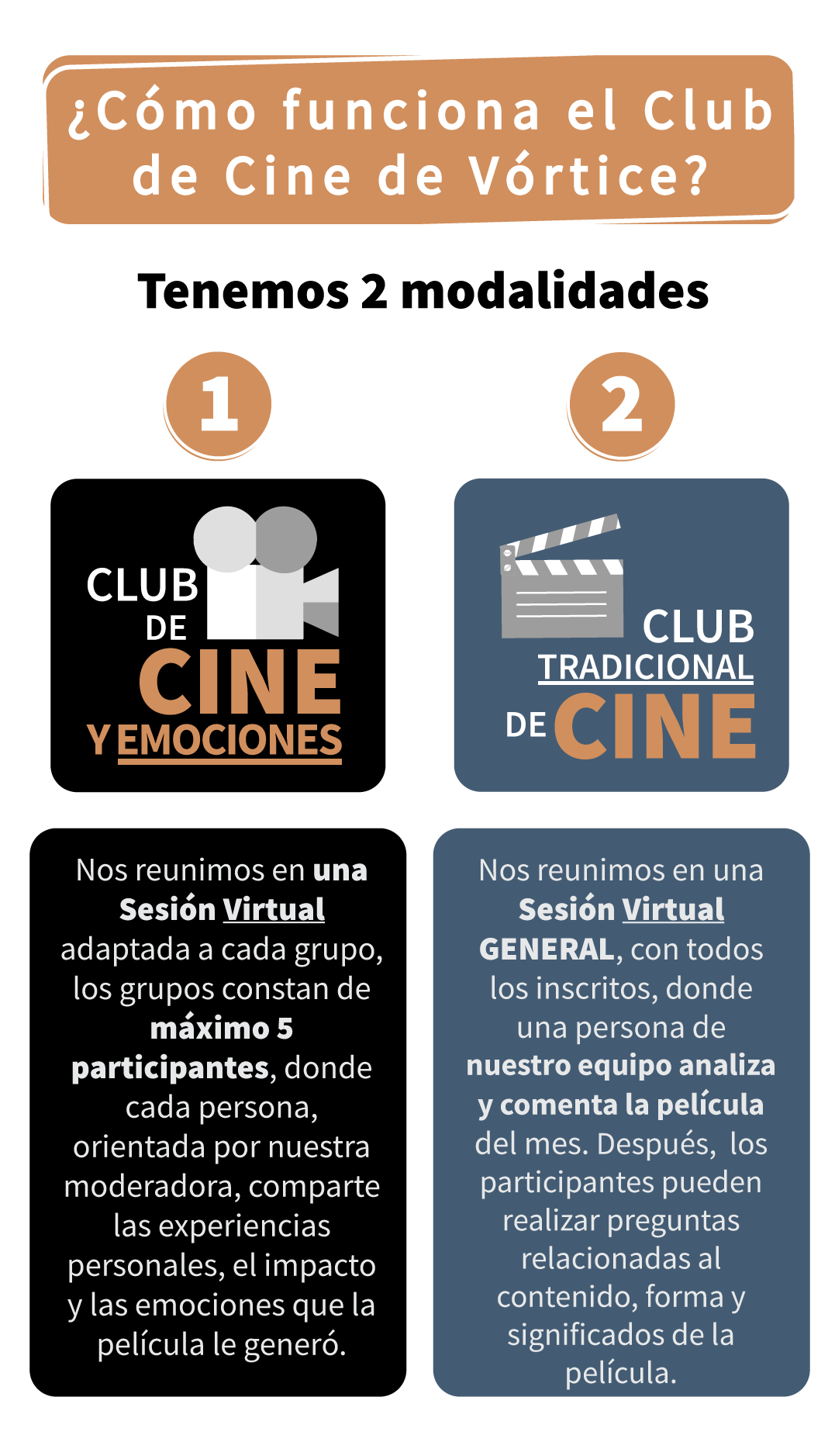 En el Club de Cine de Vórtice, invitamos a nuestros participantes a explorar emociones profundas a través de películas que seleccionamos por su contenido particular. Una vez al mes, nos reunimos virtualmente para compartir nuestras interpretaciones, emociones y reflexiones en un diálogo grupal, orientado por nuestra moderadora.